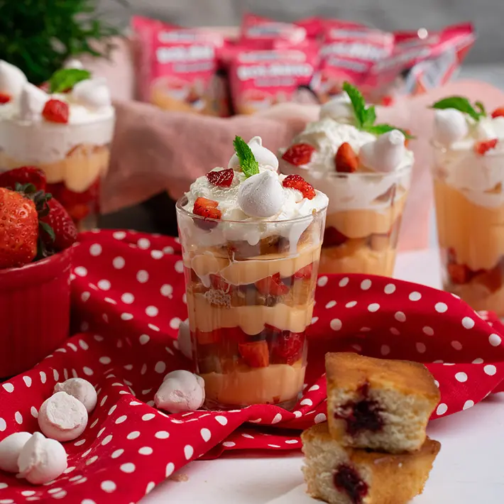 Coloque o creme no fundo do copo, cubra com as fatias do bolinho de morango Seven Boys, salpique um pouco de morango e cubra com creme. Repita esse processo até chegar no topo do copo;