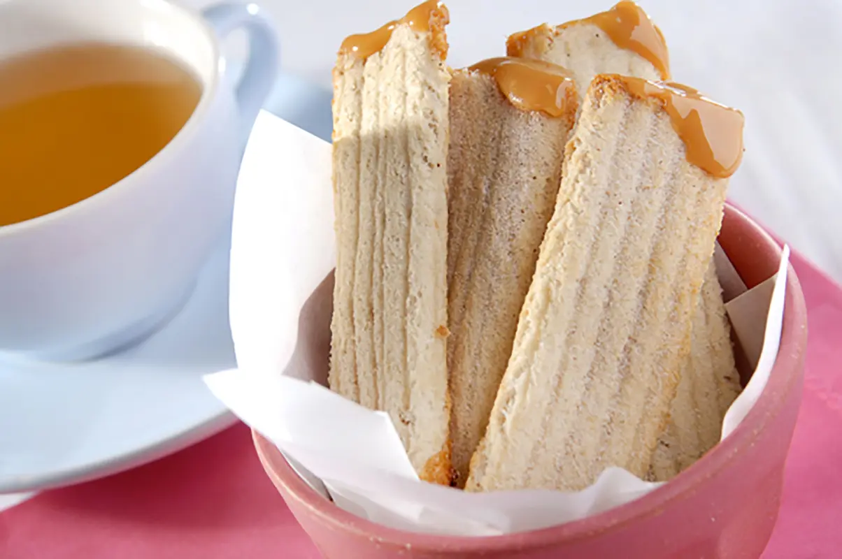 Com um pincel culinário, espalhe manteiga por um dos lados dos pães. Vire as fatias e coloque, no centro de cada uma, cerca de ½ colher (sopa) de doce de leite. Enrole os pães e coloque-os em uma assadeira;