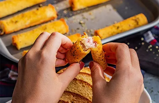 Pegue uma fatia do Pão de Milho e abra ela usando um rolo de massa até ficar bem fina. Coloque uma fatia do queijo e uma de presunto deixando um pedaço da borda do pão sem recheio, salpique um pouco de orégano e pincele um pouco de manteiga na ponta do pão, enrole apertando bem para firmar os enroladinhos e coloque com a abertura para baixo em uma forma antiaderente;