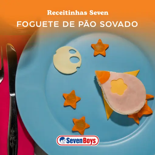 Corte o Pão Sovado Seven Boys em um formato de “gota” para a base do foguete. Posicione no prato e ara as laterais do foguete, use dois pedaços triangulares de queijo. Sobre a base do foguete, coloque uma fatias de queijo cortado do mesmo modo que a base. Corte também uma fatia de peito de peru e desenhe uma janela (por onde se verá o queijo que ficou embaixo). Para o fogo do motor do foguete e para as estrelas, use cenouras e para a lua, um círculo de queijo.