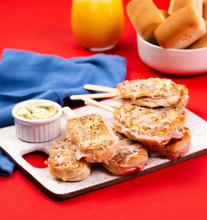 Misture a mussarela ralada com o parmesão e empane as Bisnaguinhas e coloque um palito de sorvete em uma das extremidades e faça na sanduicheira ou na frigideira, dourando de todos os lados