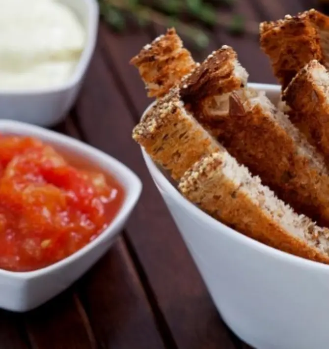 Palitos: Corte os pães em tiras finas – cinco ou seis, em cada fatia. Coloque os palitos em uma assadeira. Leve ao forno médio, por 15 minutos, até que fiquem dourados e crocantes.