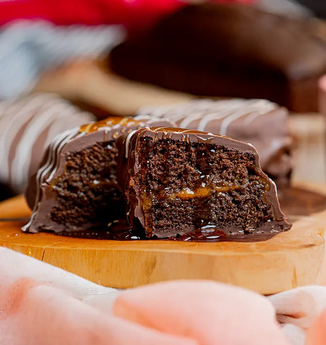 Corte o bolinho de chocolate em pedaços menores e corte ao meio, molhe os bolinhos com a mistura de leite, coloque o doce de leite e cubra com a outra metade do bolo. Depois de rechear todos os pedaços, leve para a geladeira;