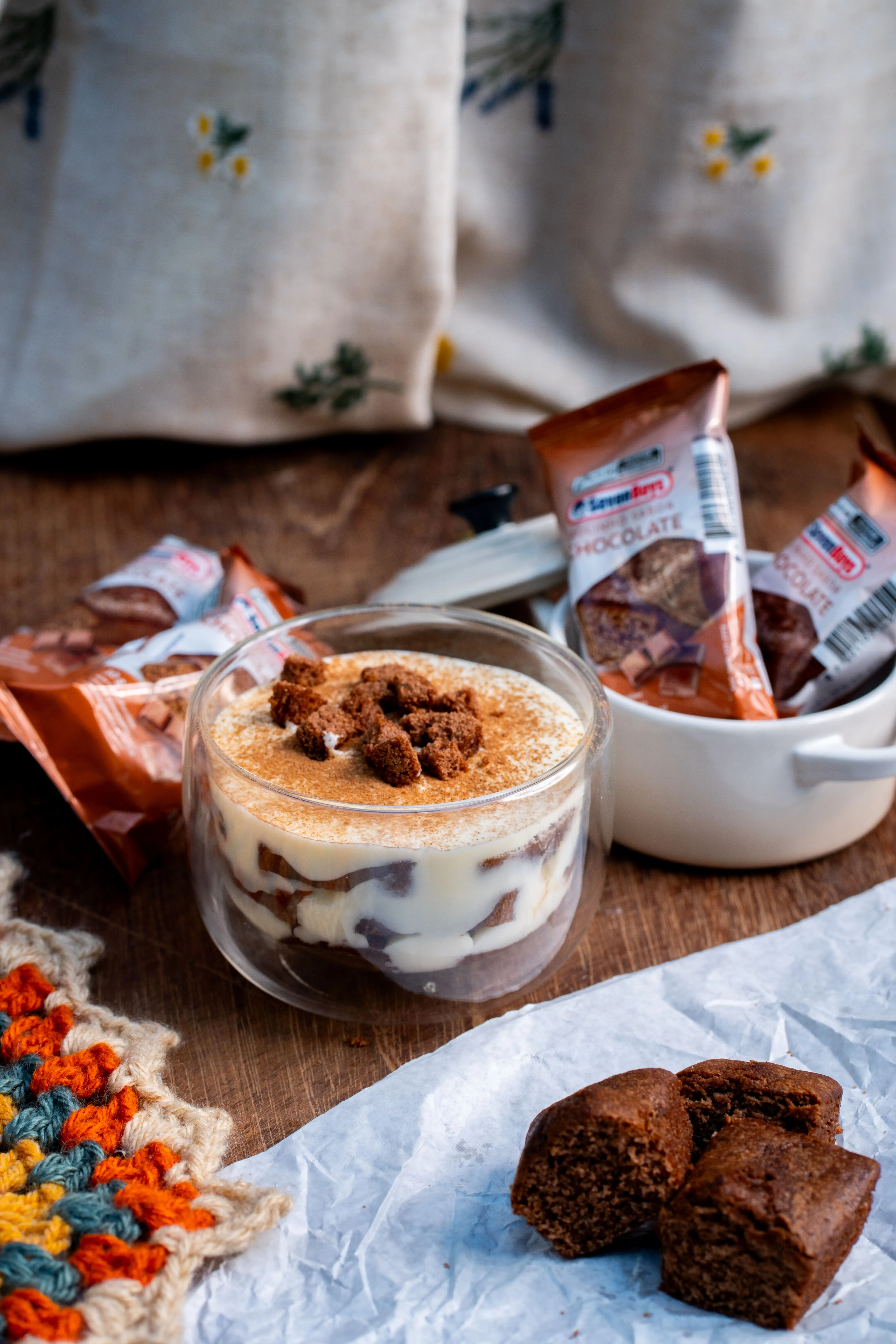 Uma versão diferente do clássico tiramisù, com bolinho de chocolate Seven Boys, café e creme cremoso.