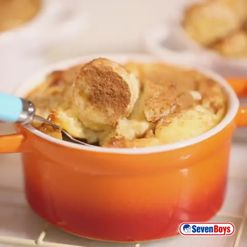 1. Encha 4 ramequins com cubos de pão e banana.