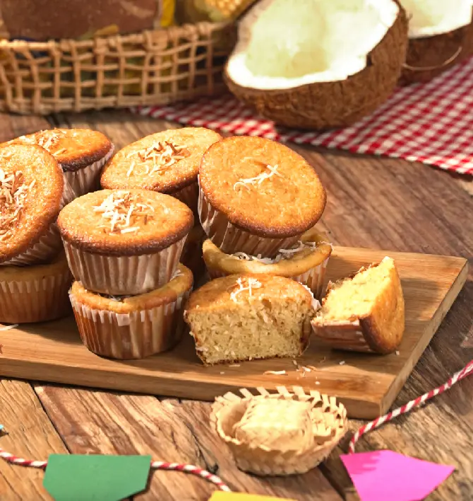 Coloque forminhas de papel para queijadinha em uma forma para muffins ou cupcakes, preencha as forminhas com uma colher bem cheia de massa e decore com os coco ralado