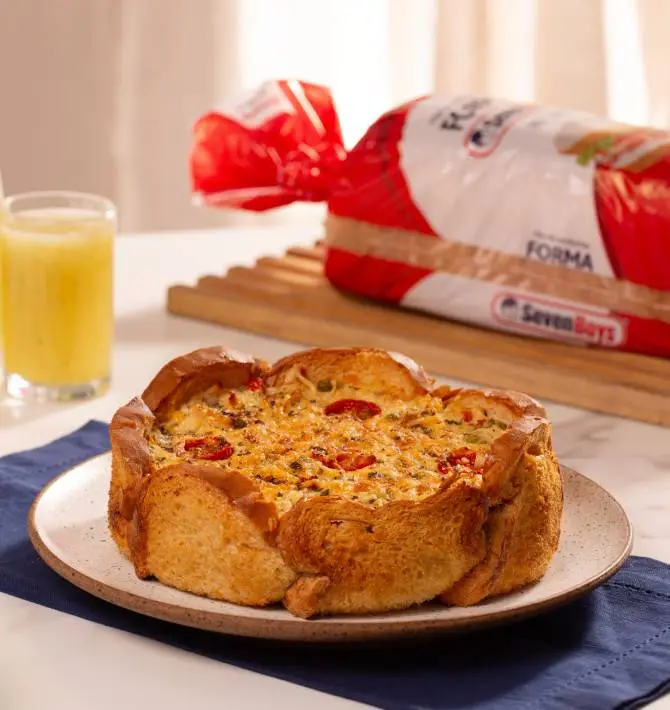 Unte com manteiga uma forma redonda de fundo falso com aproximadamente 18 cm, disponha as primeiras fatias de pão no fundo e nas laterais, pincele com a manteiga e salpique orégano, sal e pimenta do reino a gosto. Repita a operação com outra camada de pães e tempere;