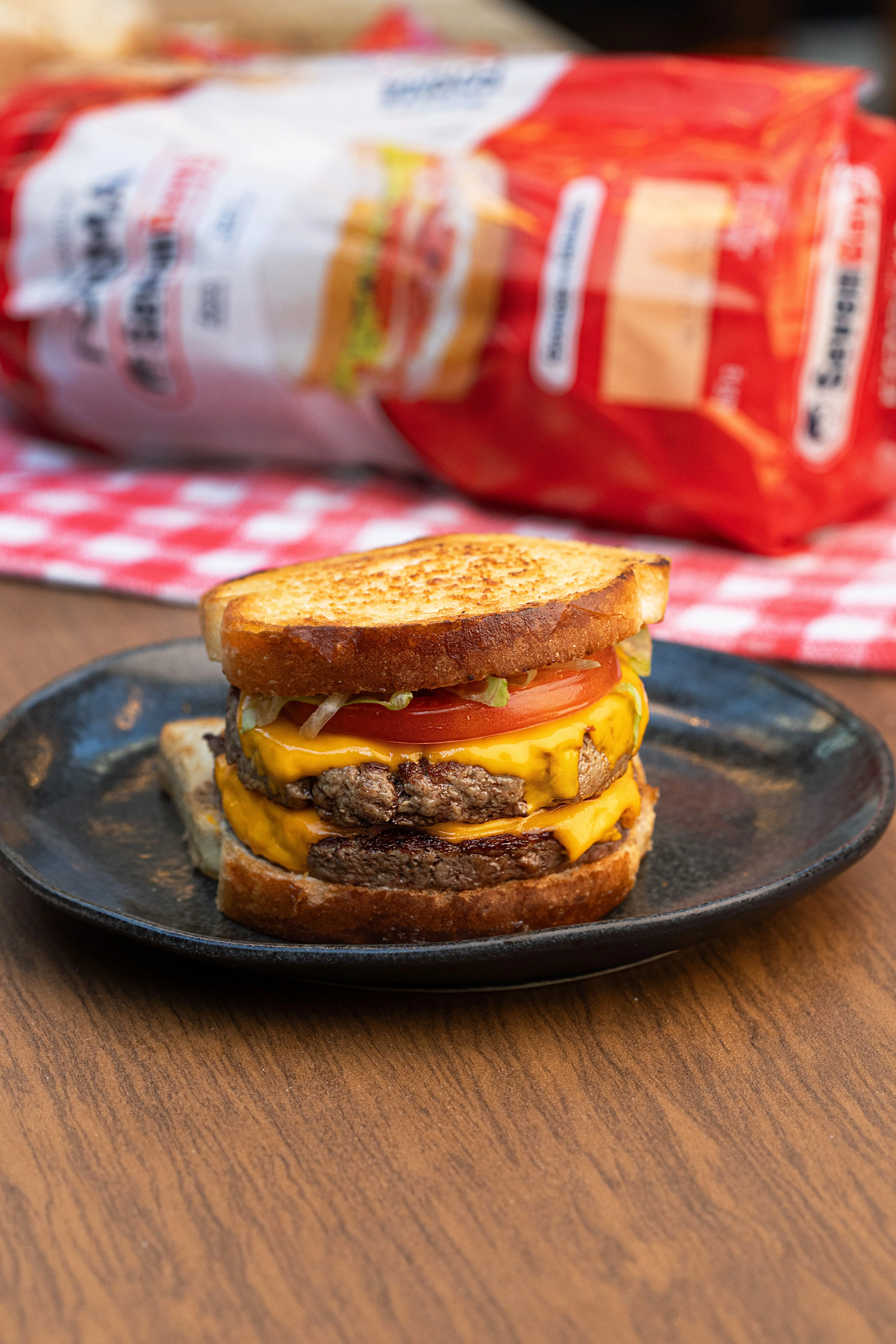 Montagem: toste o pão com manteiga em uma frigideira. Espalhe o molho nas fatias, coloque o hambúrguer com queijo, adicione os vegetais e feche o sanduíche.