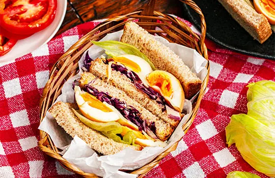 Corte os ovos ao meio. Torre as fatias de pão na manteiga, acrescente o queijo, a salada, os ovos e finalize com mais queijo e salada. Feche o sanduíche e sirva imediatamente.