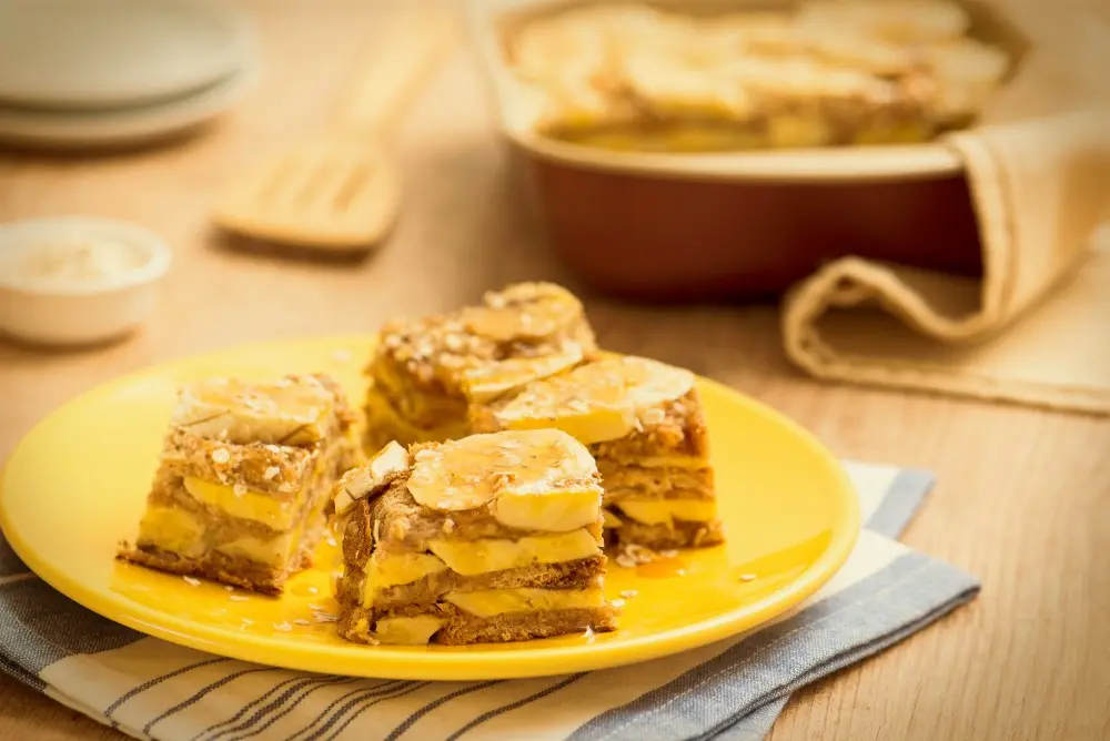 Forre o fundo de uma assadeira retangular média com 1 camada de pedaços de pão, seguida por 1 camada de rodelas de banana (aproximadamente 2 bananas);
